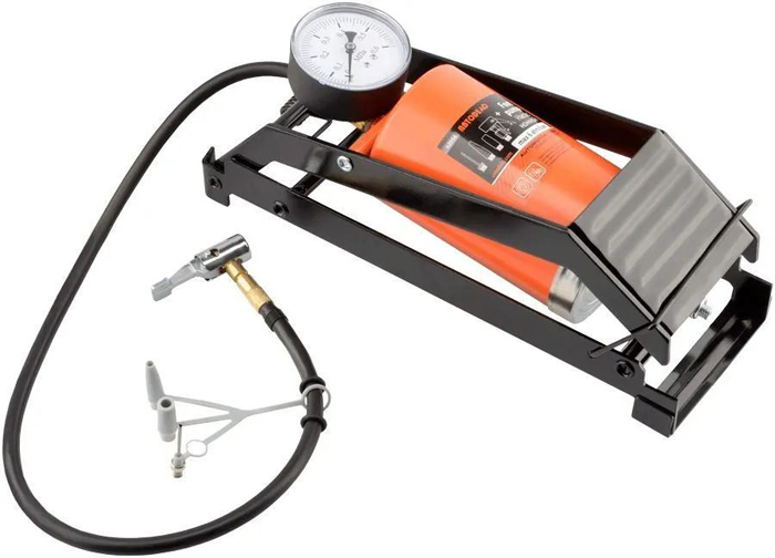 Насос автомобильный ножной предназначен для накачивания шин легковых автомобилей с использованием мускульной силы ног. Максимальное создаваемое давление - 6 атм.