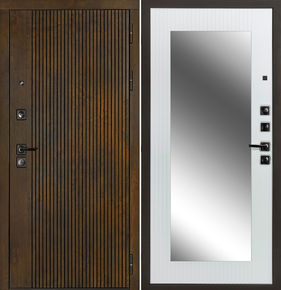 Входная дверь Василёк – идеальное сочетание функциональности и красоты. Эта цельногнутая модель толщиной 110 мм обеспечит вашему дому максимальную защиту благодаря трехрядным петлям открывания на 180° и противосъёмным хромированным штырям. За комфортное закрытие отвечает ночной засов черного цвета и глазок сбоку. Эстетика двери завораживает: внешняя сторона выполнена из объемной фрезерованной панели под дуб рыжий с патиной и лаком, а внутренняя украшена зеркалом и белой матовой МДФ-панелью. Для тепла и тишины внутри дома предусмотрены три слоя качественного утеплителя.