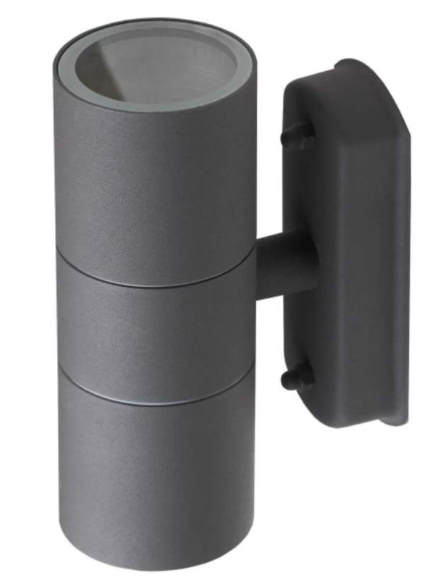 Декоративная подсветка предназначена для освещения уличной территории, а также отлично подойдет для создания световых акцентов внутри жилого или офисного помещения. Настенная модель выполнена в металлическом корпусе серого цвета. Светильник имеет цилиндрический плафон, рассчитанный на две галогенных лампы с цоколем GU10 и максимальной мощностью 60 Вт каждая. Рекомендуется для освещения территории площадью до 6 м2.