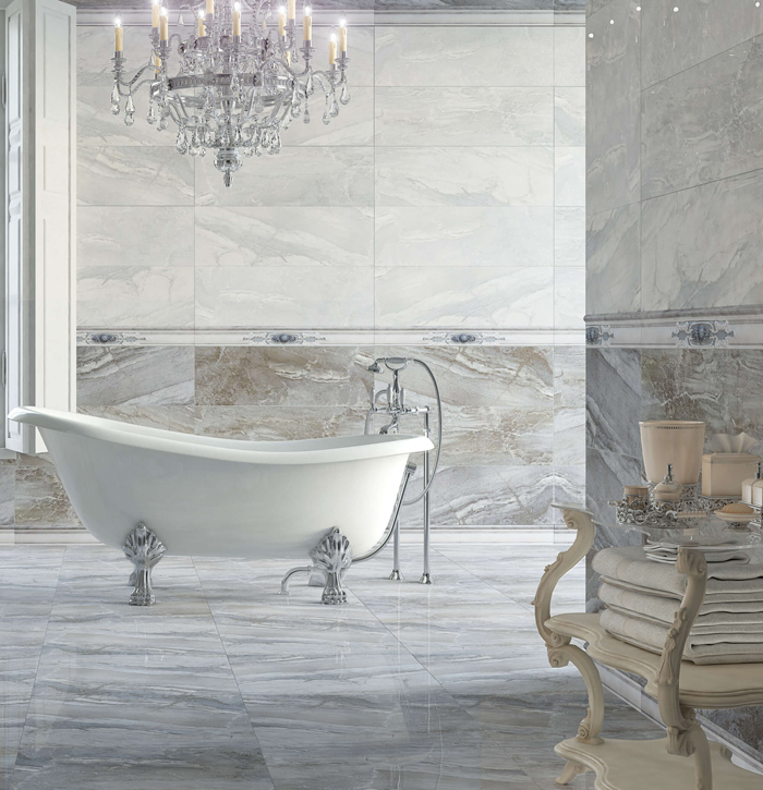 Глянцевая плитка Persia Perla Rectificado 30x90 прямоугольной формы, белого цвета. Данный вид плитки, имитирующий камень, подойдет для стены Вашей ванной.