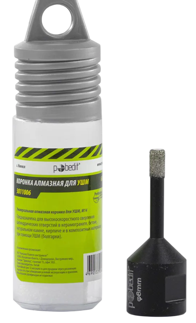 Коронка алмазная предназначена для высокоскоростного сверления цилиндрических отверстий в керамограните, бетоне, натуральном камне, кирпиче и в композитных материалах при помощи УШМ. Режущий инструмент изготовлен из стали, что обеспечивает прочность и долговечность коронки.