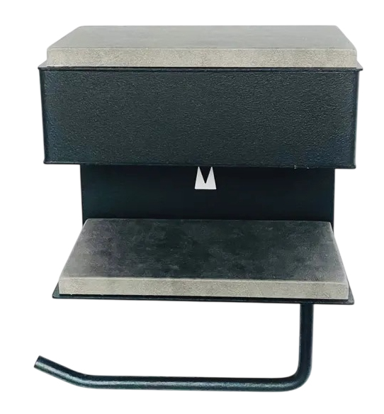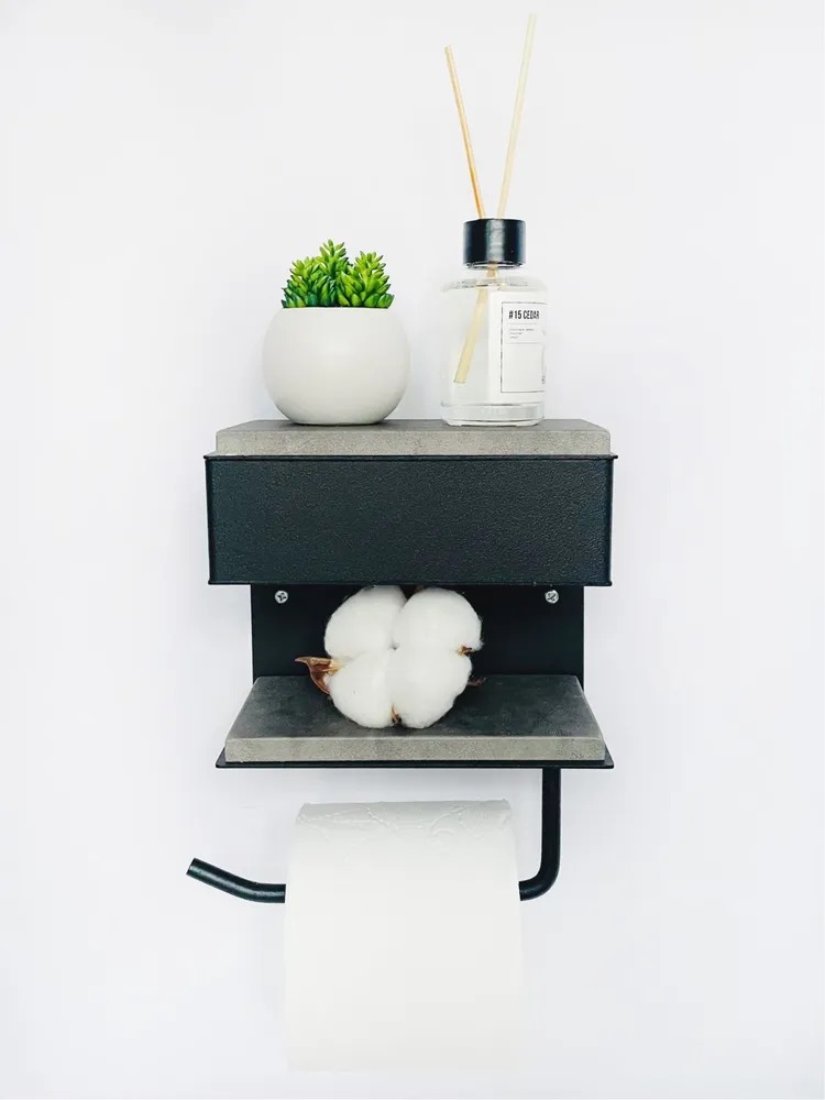 Удобный металлический держатель для туалетной бумаги с полочкой для телефона или освежителя и ящиком для хранения. (большая пачка салфеток в короб не войдёт). Изделие имеет оригинальный и стильный дизайн. Металлическая часть изготовлена из стали с износостойким полимерным покрытием. Вставка из МДФ с ПВХ покрытием имеет надёжное покрытие.
