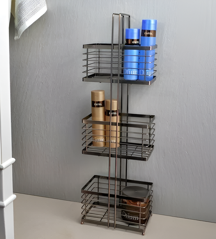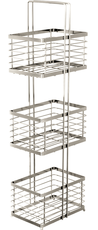 Полка прямоугольная трехэтажная выполнена из стали. Простой и элегантный дизайн быстро пополняет ряды поклонников этого изделия. Три яруса для хранения и удобная ручка для переноски делает эту этажерку удобным и красивым дополнением вашей ванной комнаты.