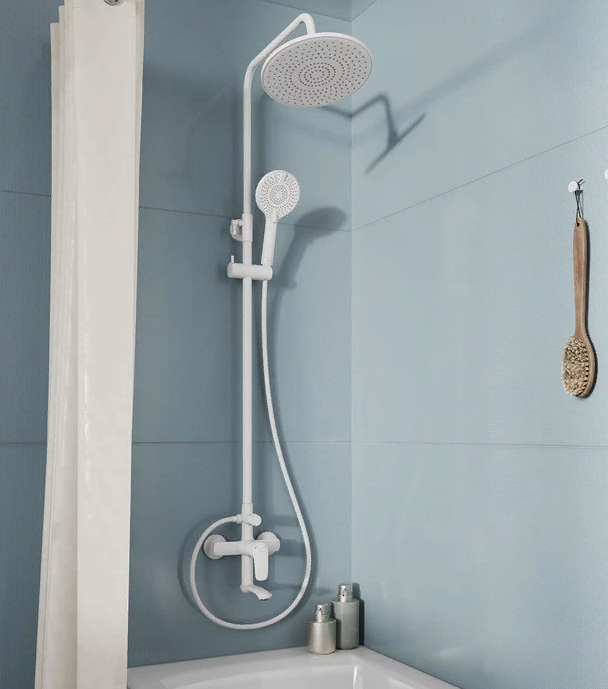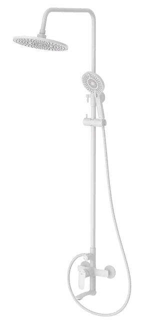 Душевая система отличается универсальным характером: основной акцент в его дизайне приходится на плавные линии корпуса и трендовый белый цвет. Большой диаметр верхней лейки способствует равномерному распределению струи. Увеличенный вынос верхнего душа дарит максимальную свободу движений. Поворотный излив эстетично встроен в корпус, вода из него поступает в ванну под комфортным углом.