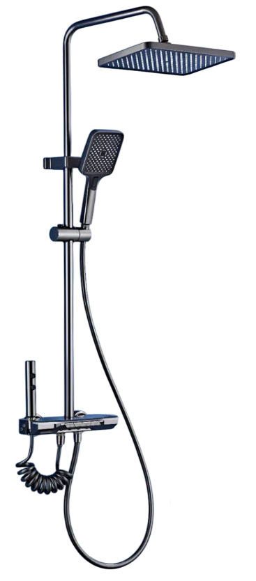 Стильная душевая система серого матового цвета со смесителем выполнена из авиационного алюминия, обеспечивая долговечное пользование. В комплект входит: квадратный верхний душ "Тропический дождь", душевая лейка с 3-мя режимами подачи с микро-соплами для массажного эффекта, гигиеническая лейка, шланг.