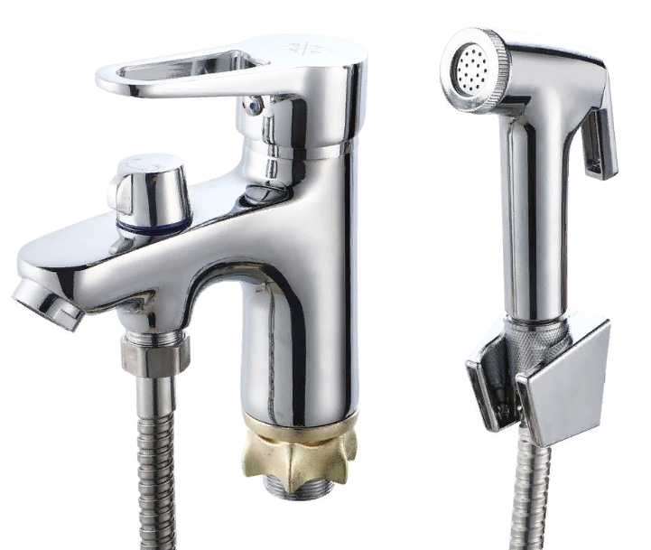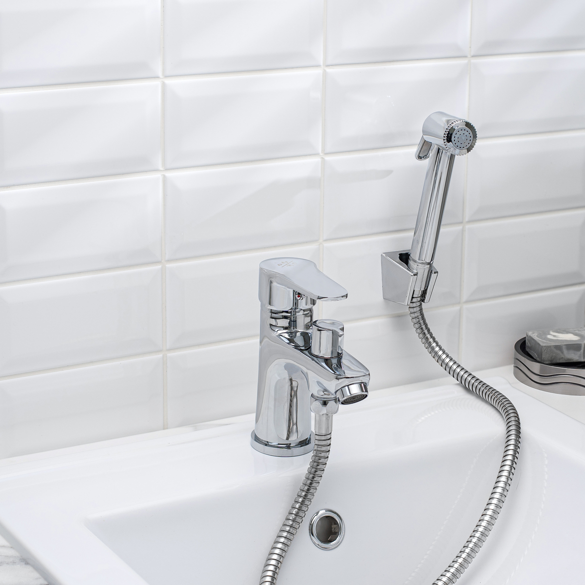 Смеситель для умывальника с гигиеническим душем. Хромированная поверхность не потеряет со временем свой роскошный вид, а уход за ней сводится к протиранию мягкой салфеткой.