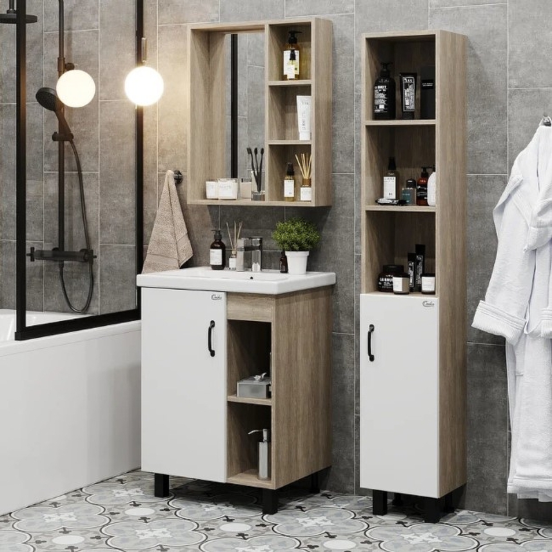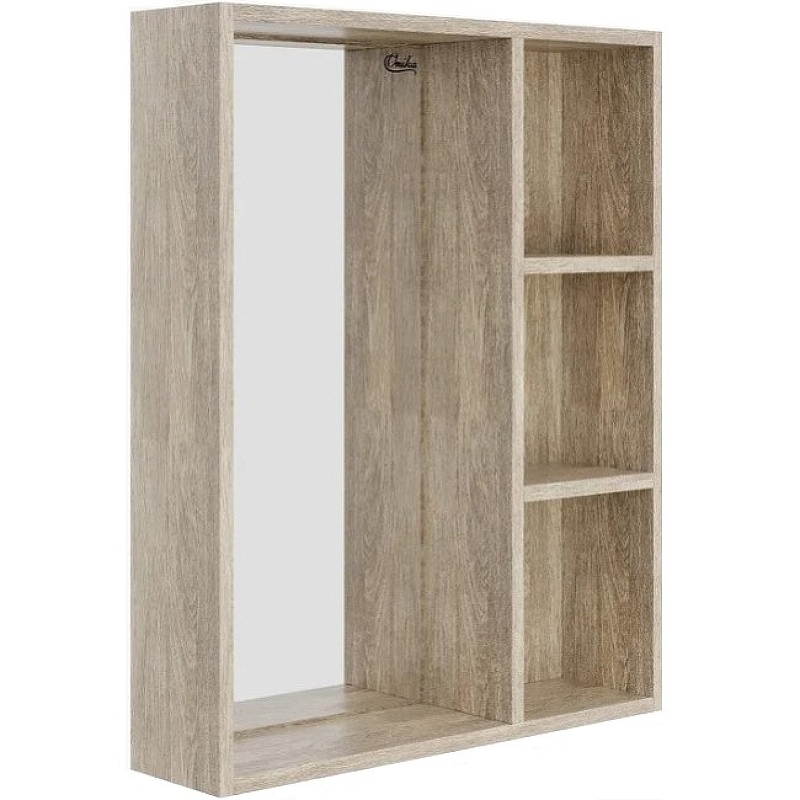 Зеркало-шкаф отражает современные тенденции в дизайне мебели для ванных комнат: минимализм с простыми и понятными формами, цвета дуба с роскошной текстурой, отсутствие лишних деталей.