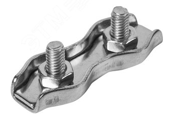 Материал: углеродистая сталь с антикоррозионным цинковым покрытием. При установке зажима стальной трос или канат размещается на пластине-основании по обоим краям, затем прижимается второй пластиной и затягивается гайками.