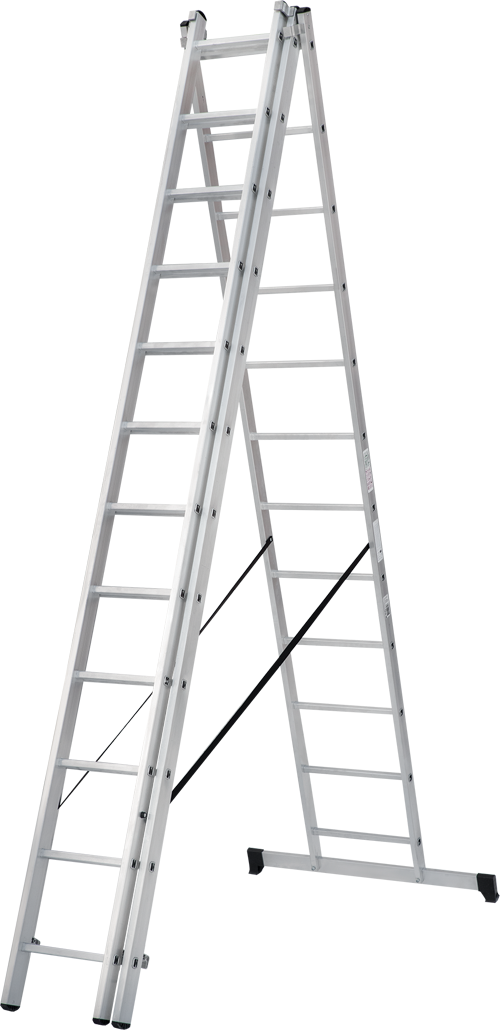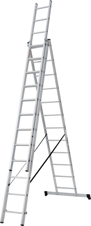 Лестница алюминиевая трехсекционная представляет собой три соединенные секции и в зависимости от их расположения используется как стремянка, стремянка с выдвинутой секцией, приставная односекционная, приставная выдвижная лестница. Оптимальна для использования на лестничных маршах. Для защиты от расхождения используются страховочные ремни.