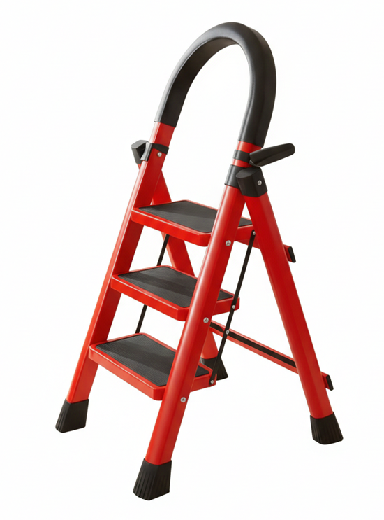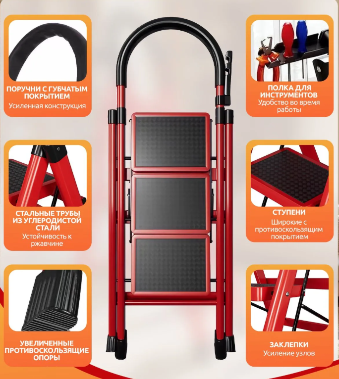 Антискользящее покрытие на ступеньках лестницы предотвращает скольжение при движении по ним, что делает использование этого инструмента безопасным. Лестница-стремянка может использоваться как внутри помещений, так и на открытом воздухе. Она легко транспортируется благодаря компактному размеру и легкости в обращении.
