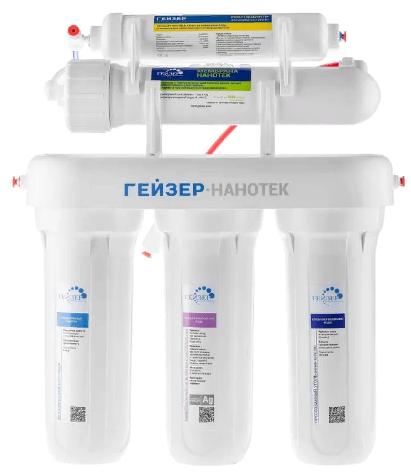 Фильтр для воды-это инновационный мембранный фильтр, конструктивно схожий с системами обратного осмоса, обладающий уникальными свойствами- наномембрана удаляет все загрязнения как и обратный осмос, но частично сохраняет природный солевой состав воды, т. е. на выходе получается не "мертвая" дистиллированная, а чистая и полезная питьевая вода. Фильтр снижает содержание солей жесткости в воде на 80%, что обеспечит отсутствие загрязнений в очищенной воде, накипи в чайниках, утюгах, кофемашинах и т. д. Размер пор мембраны составляет 0,001 мкм, поры находятся посередине между порами обратноосмотических и ультрафильтрационных мембран. В качестве картриджа предочистки используется новая разработка - картридж БАФ, содержащий мультикомпонентную загрузку на основе сорбентов и ионообменных материалов, что позволяет удалять не только хлор и органические примеси, но и снижать содержание железа и тяжелых металлов, что значительно увеличивает ресурс мембраны.