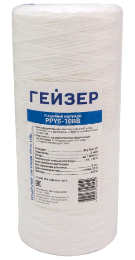 Картридж предназначен для очистки воды от нерастворимых примесей в магистральных фильтрах Гейзер типоразмера ВВ. Изготовлен из полипропиленового шнура, имеющего большую грязеемкость. Картридж не подлежит восстановлению.