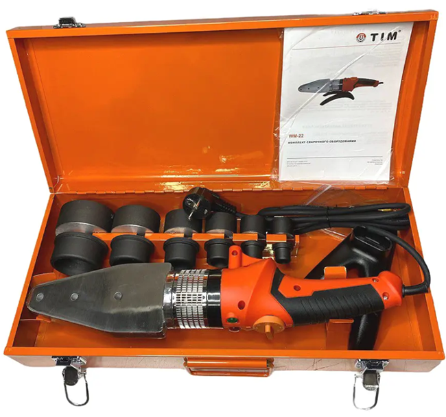 Сварочный комплект используется для пайки полипропилена путем одновременного нагрева соединяемых трубы и фитинга и последующей вставкой с полифузией. Позволяет сваривать как армированную, так и не армированную трубы.
