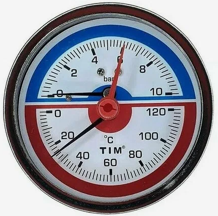 Термоманометр аксиальный служит для одновременного измерения температуры и давления жидкости в системах водоснабжения, отопления и охлаждения. Для снятия показаний предусмотрены две шкалы (давления и температуры). Давление среды, которое необходимо измерить, не должно превышать значение шкалы манометра.