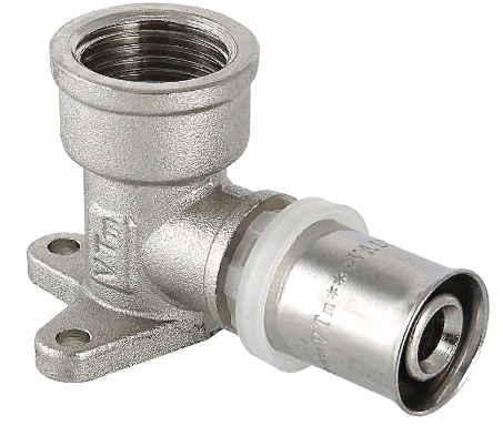 Угловой пресс-фитинг с переходом на внутреннюю резьбу и креплением (водорозетка) марки Valtec предназначен для создания неразъемных соединений трубопроводов из металлополимерных труб, а также труб из сшитого полиэтилена PE-X и полиэтилена повышенной термостойкости PE-RT, с компонентом системы, имеющим резьбовое подключение. Используется в системах питьевого и хозяйственного водопровода, горячего водоснабжения, отопления, а также на технологических трубопроводах, транспортирующих жидкости, не агрессивные к материалам труб и соединителей. Корпус пресс-фитинга выполнен из горячештампованной никелированной латуни. Рабочее давление - 10 бар. Температура рабочей среды от -30ºС до +115ºС. Длина изделия - 51 мм., высота - 44 мм., вес - 141 мм. Диаметр 1 - 1/2"; 2 - 20 мм.